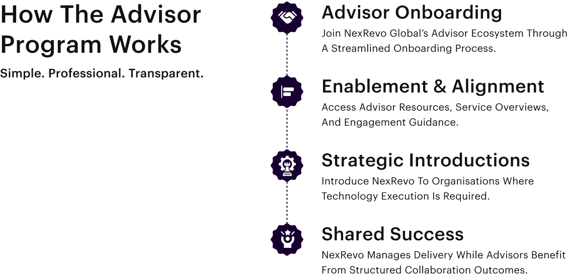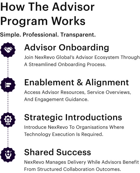 If you believe in long-term collaboration, trusted recommendations, and delivering real value to clients, NexRevo Global welcomes you into its advisory ecosystem.